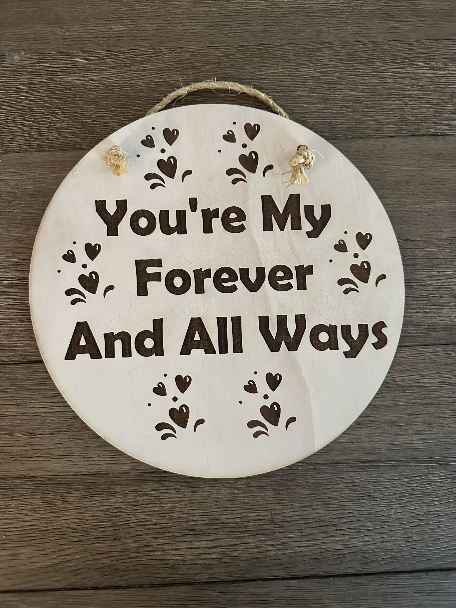 Sometimes the simplest words carry the most weight. Our Laser-Engraved Sentimental Plaque is designed to bring a touch of warmth and heart to any room. Crafted on a beautiful wood round, this piece features the charming phrase “You’re My Forever And All Ways” in bold, clean lettering.